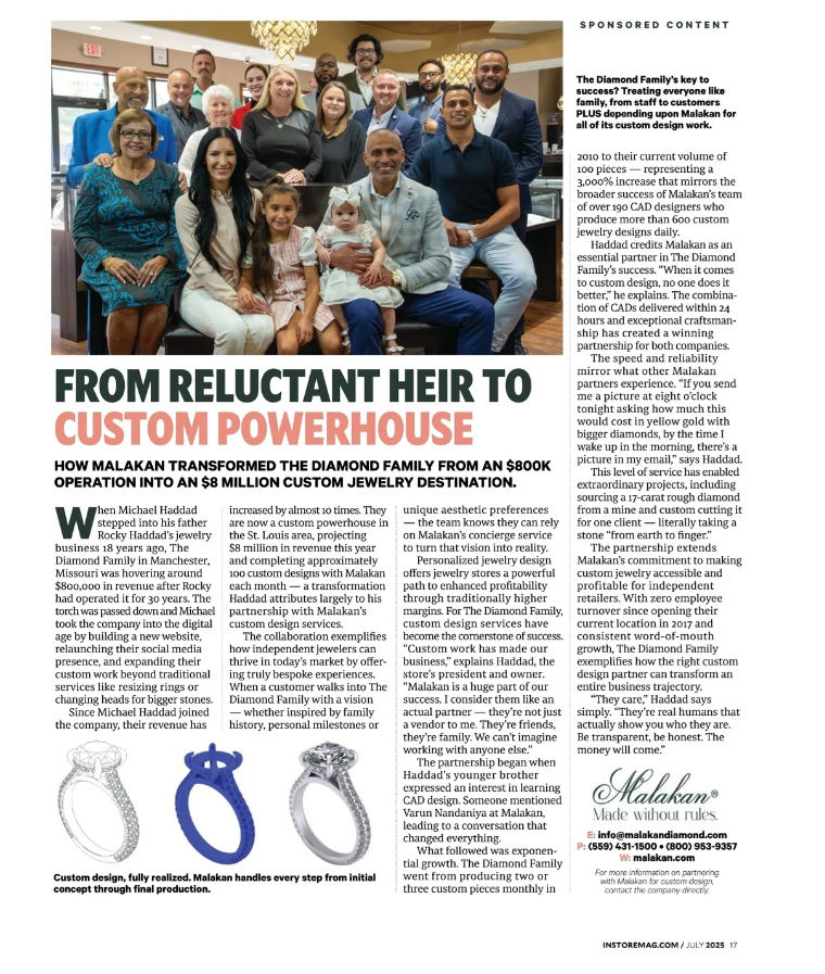 The partnership extends Malakan’s commitment to making custom jewelry accessible and profitable for independent retailers. With zero employee turnover since opening their current location in 2017 and consistent word-of-mouth growth, The Diamond Family exemplifies how the right custom design partner can transform an entire business trajectory.